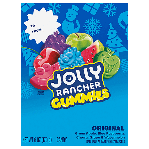 A mix of five fruity favorites for the whole family in just one box of chewy gummies? You wouldn't have thought it possible if you didn't know JOLLY RANCHER gummies Christmas candy. This gift box of fruit flavored gummies offers fun, flavorful fruity shapes that every member of the family will be happy to choose from this holiday season. Featuring blue raspberry, green apple, cherry, grape and watermelon flavors, JOLLY RANCHER gummies offer a combination of the undisputed original flavor classics you know and love. Grab a few gift boxes for last-minute gifting to friends, co-workers or family members — but don't forget to save a box or two of delectably sweet and chewy gummies for yourself during all of that sharing! These fruit flavored candies make the perfect covered Christmas candy bowl display, thanks to vibrant colors and attractive JOLLY RANCHER fruit shapes. They're also great treats for stuffing festive Christmas stockings, filling holiday gift bags and adorning gingerbread houses this holiday season. If you want a small candy with a big fruity taste to keep your taste buds busy during festive movie nights, lunch hours, snack breaks, family gatherings and more, JOLLY RANCHER chewy gummies are the treat for you.
